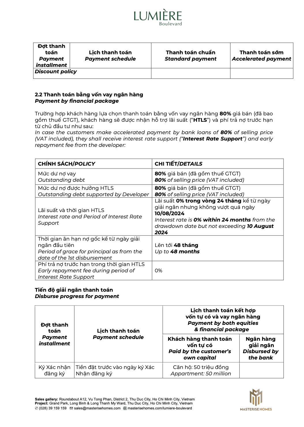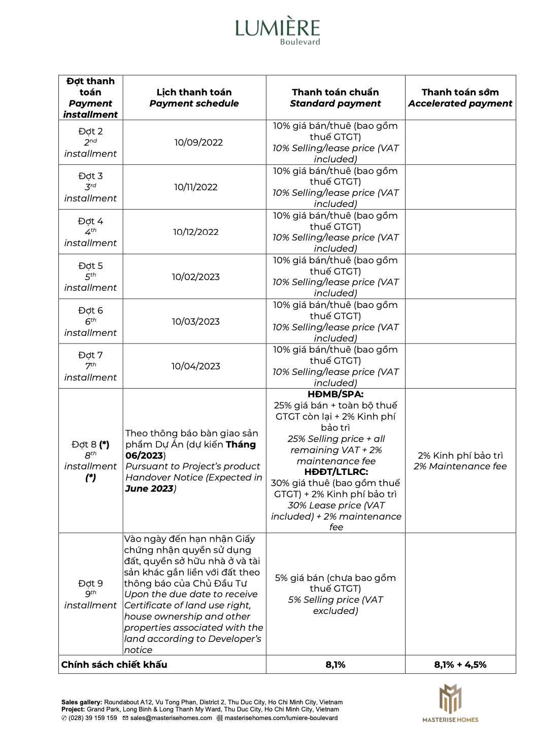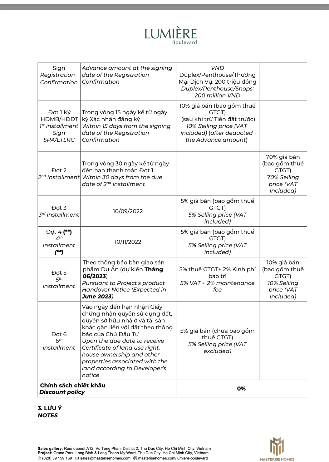 Chính sách thanh toán và tiến độ thanh toán phân khu Lumière Boulevar