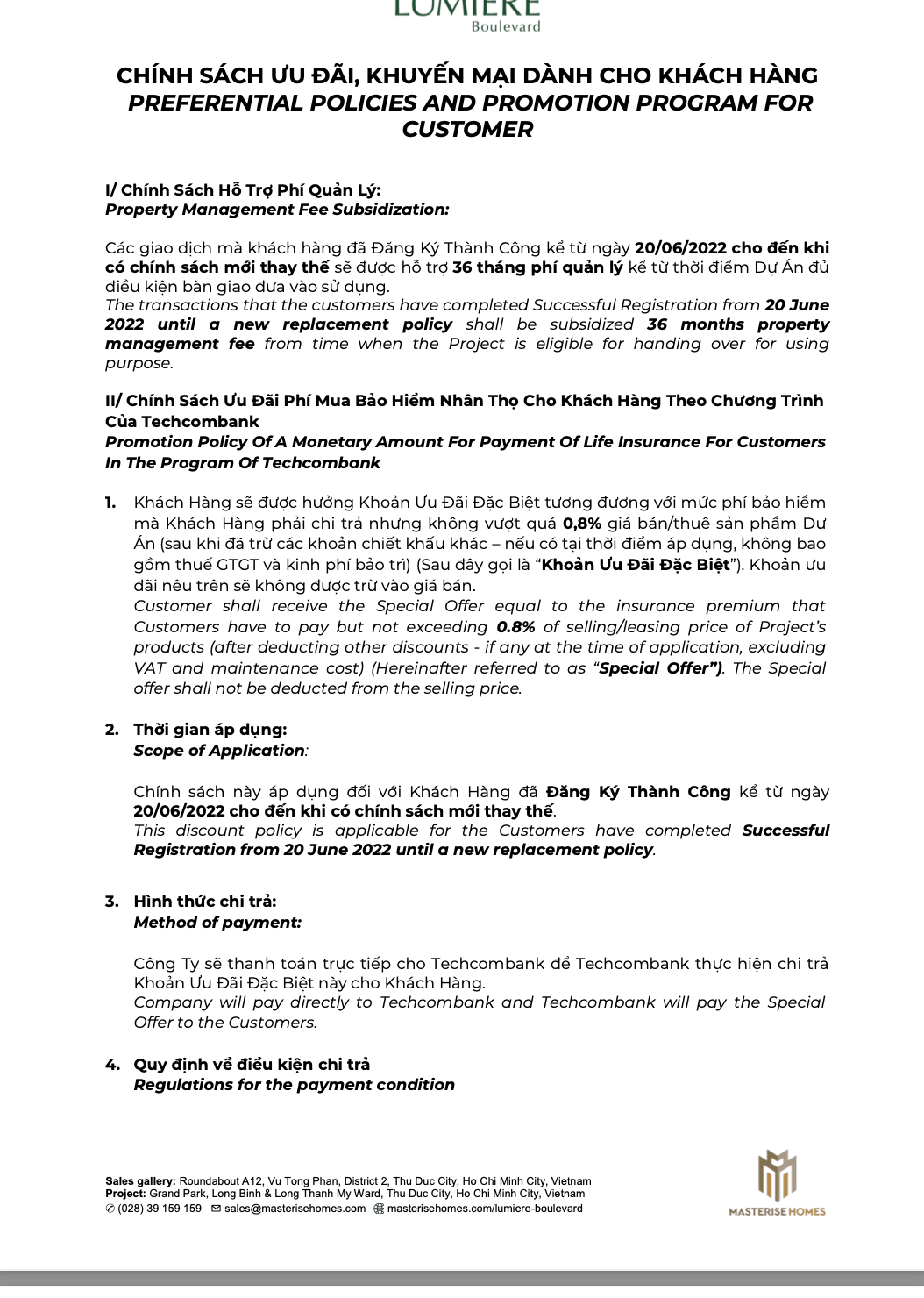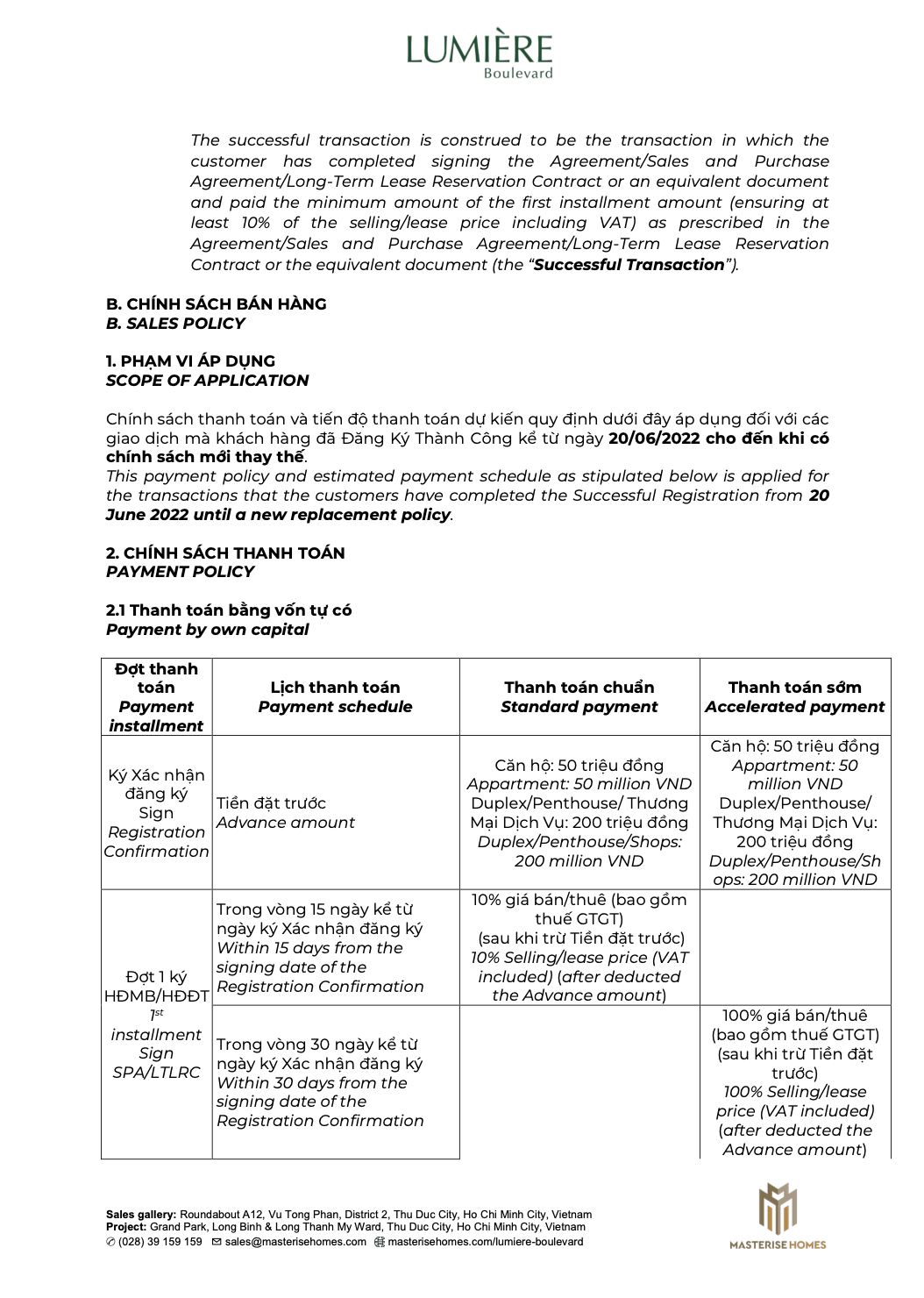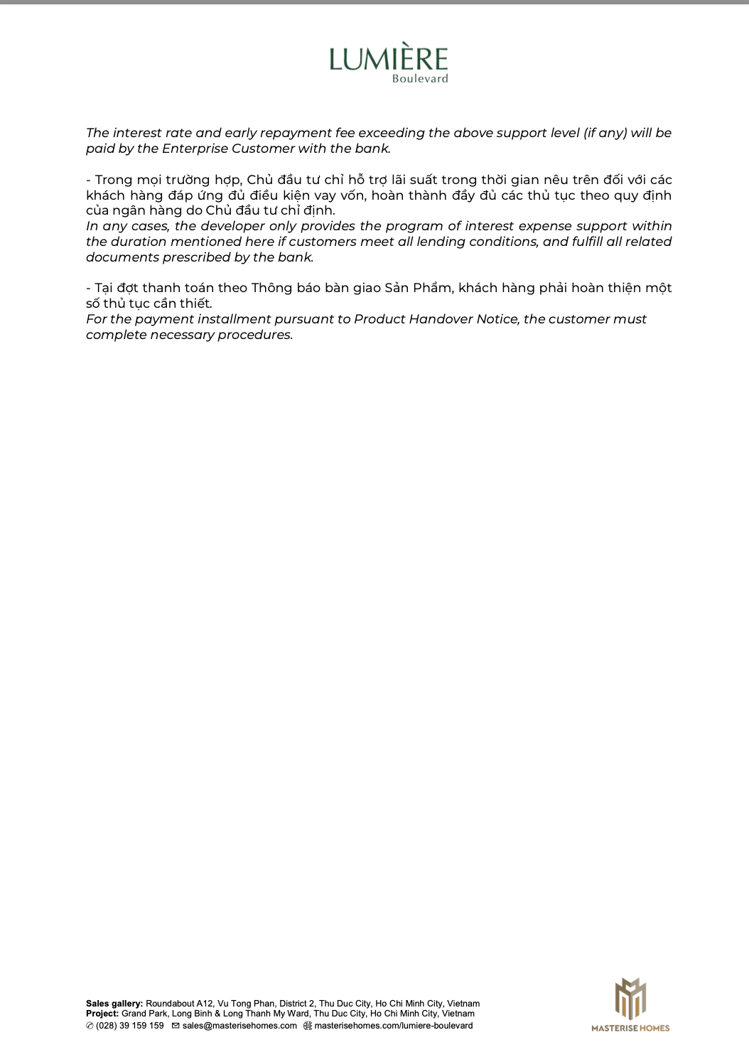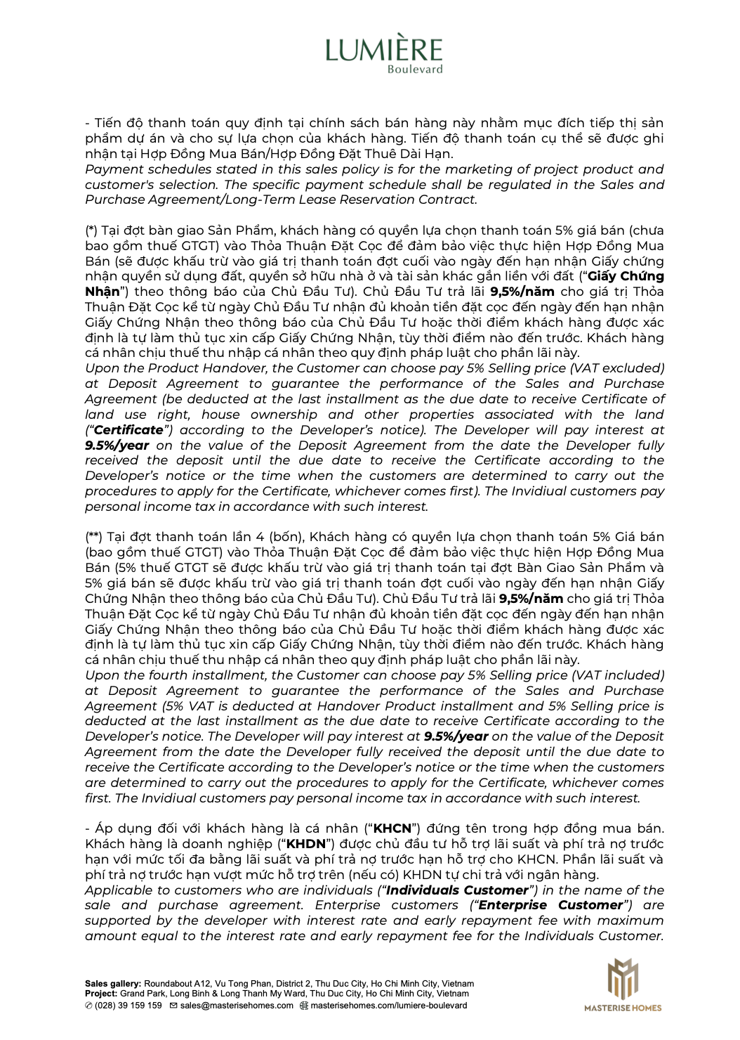 Chính sách thanh toán và tiến độ thanh toán phân khu Lumière Boulevar