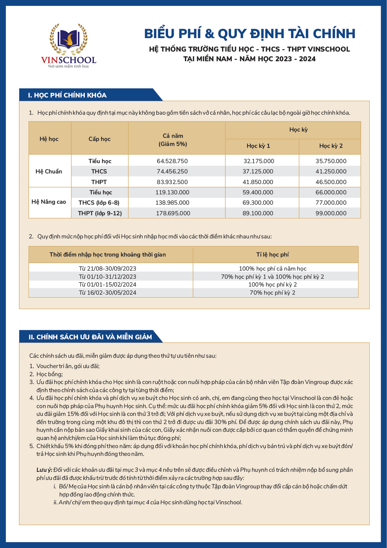 Học phí Vinschool năm học 2023-2024 hệ thống trường Tiểu Học – THCS – THPT tại miền Nam quy định như sau: