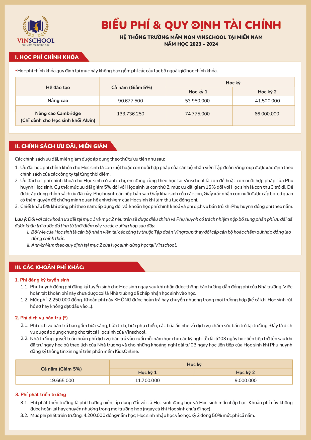 Học phí Vinschool năm học 2023-2024 hệ thống trường mầm non tại miền Nam quy định như sau: