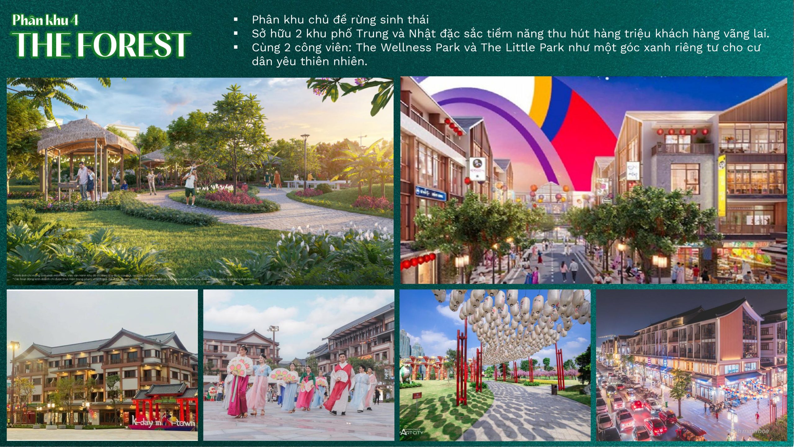 Đặc trưng của phân khu The Forest là rừng sinh thái, sở hữu cho mình 2 khu phố Trung và Nhật đặc sắc đầy tiềm năng thu hút hàng triệu khách hàng vãng lai cùng 2 công viên The Wellness Park và The Little Park như 1 góc xanh riêng cho cư dân yêu thiên nhiên.