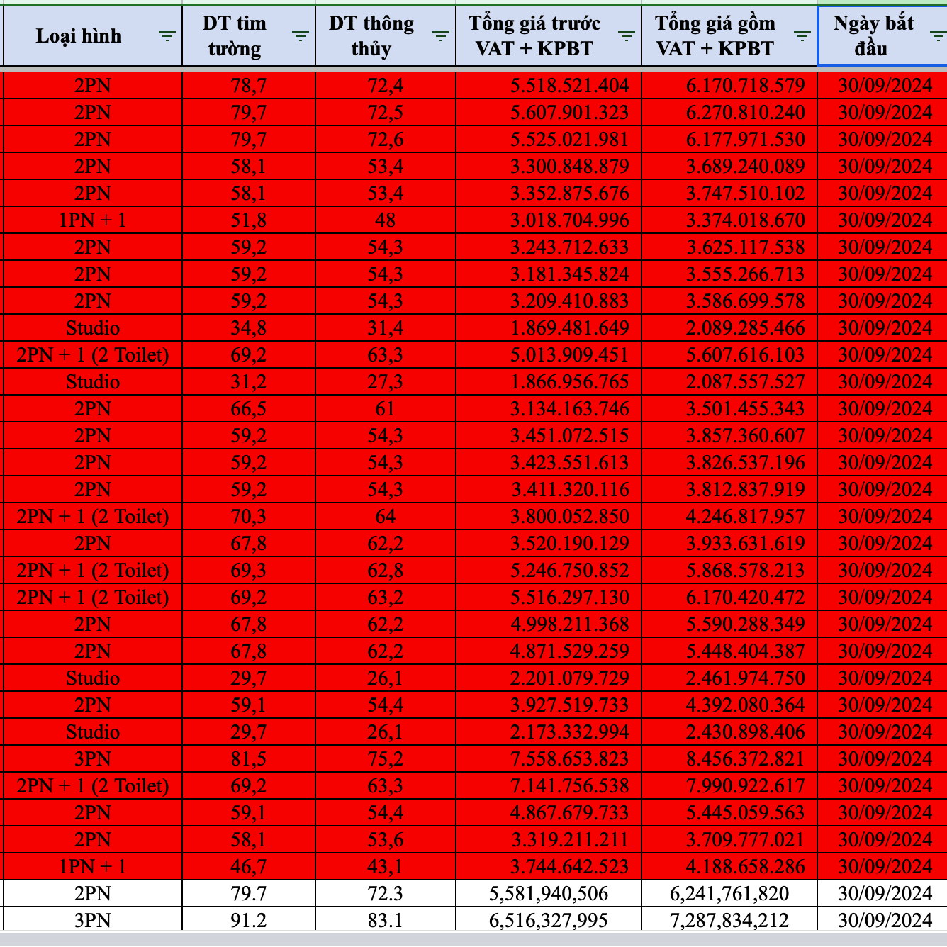 Bảng giá căn hộ và báo giá theo nhu cầu KH tại Vinhomes Grand Park